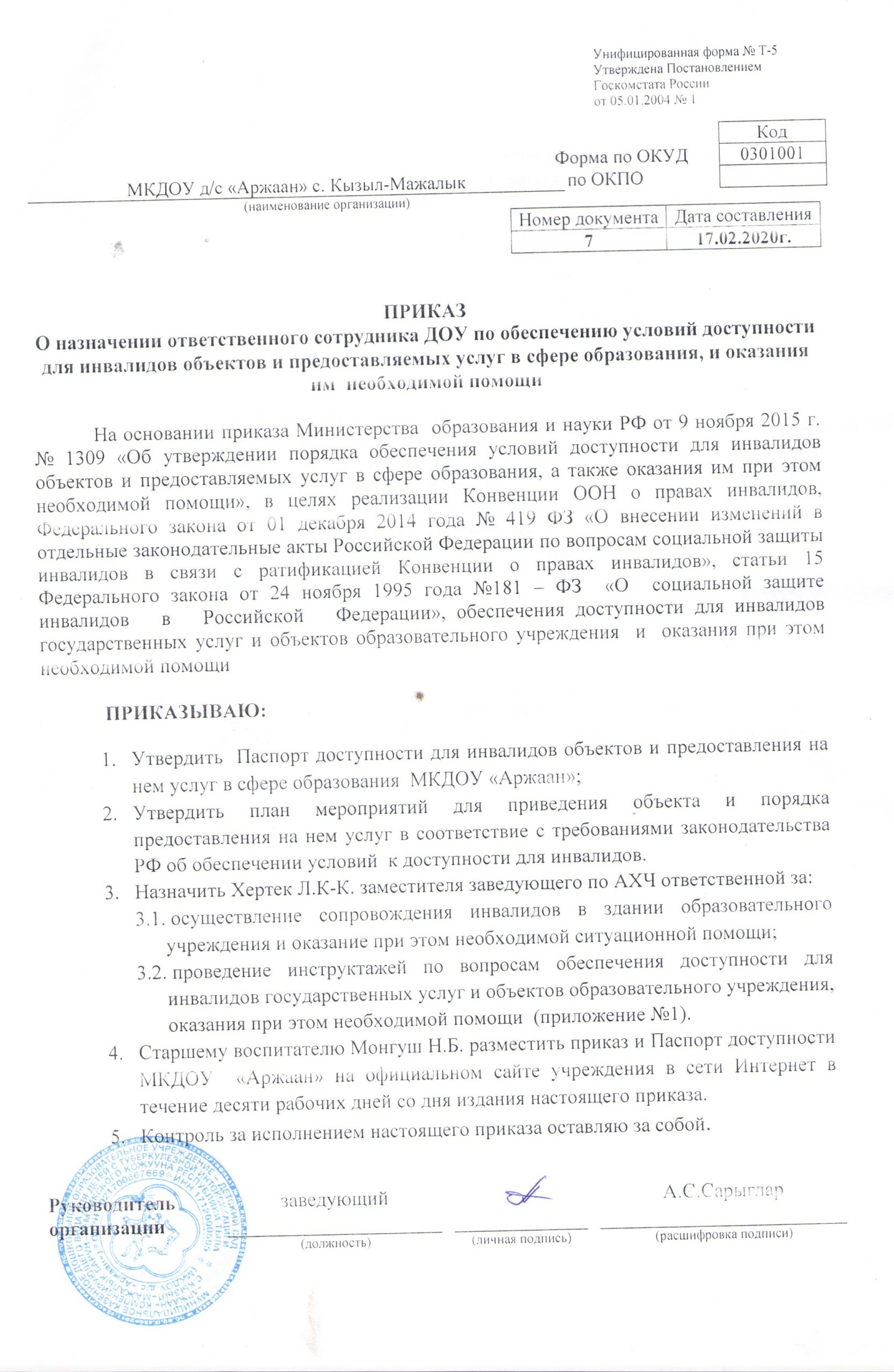 — приказ о назначении ответственного сотрудника ДОУ по обеспечению условий доступности для инвалидов объектов и предостав.услуг в сфере образ-я Скачать